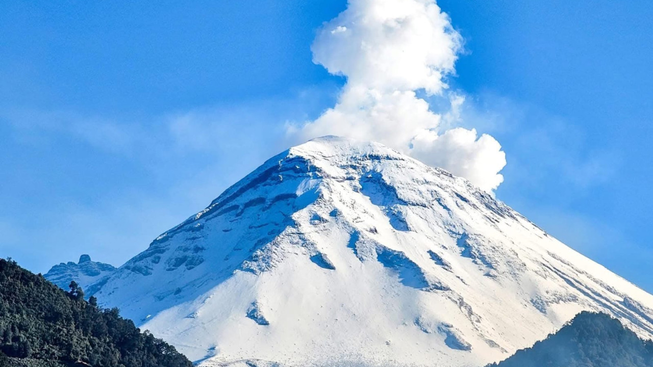 En la antesala de la Navidad, las bajas temperaturas revistieron de nieve al volcán Popocatépetl, que en los últimos días registró una intensa actividad con la exhalación de ceniza.
