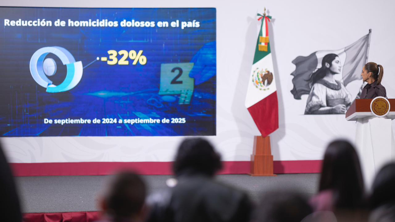 La Presidenta Claudia Sheinbaum Pardo resaltó que, a un año de gobierno, la reducción de 32 por ciento en los homicidios dolosos, entre septiembre de 2024 y septiembre de 2025, es muy significativa ya que representa 27 personas que no fallecen diariamente por este delito, lo cual lo atribuyó a la implementación de los cuatro ejes de la Estrategia Nacional de Seguridad.
