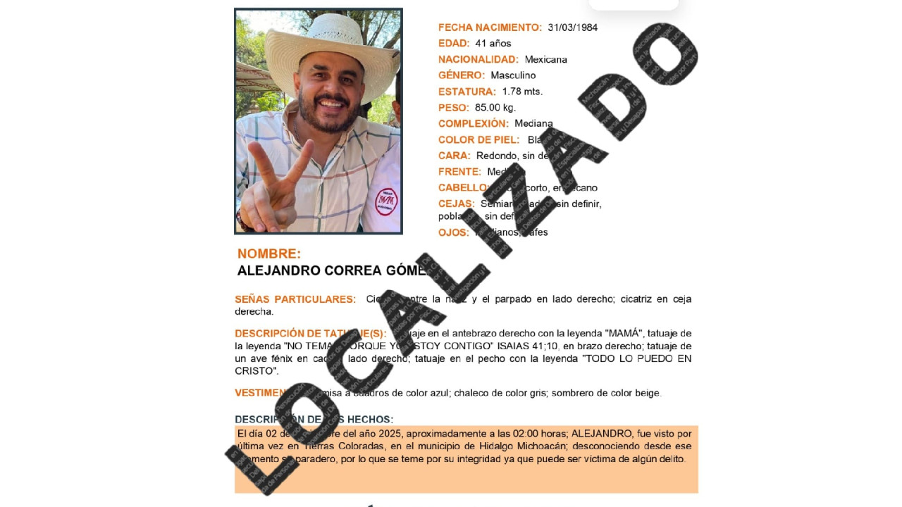 La Fiscalía General de Michoacán informó que Alejandro Correa, exalcalde de Zinapécuaro reportado como desaparecido este domingo, ya fue localizado con vida.