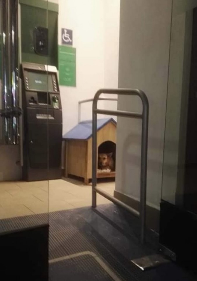 Una perrita llamada “Flaquita” fue abandonada en un cajero del Banco Nacional de Bolivia (BNB), por lo que personal del lugar decidió adoptarla y darle su propia casita dentro del lugar para que este protegida del frío.