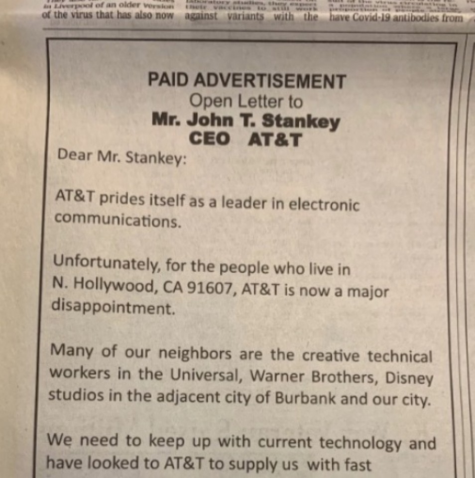 "Sin embargo, aunque AT&T anuncia velocidades de hasta 100 Mbps para otros barrios, la más rápida que AT&T nos ofrece ahora es de solo 3 Mbps. Sus competidores tienen ahora velocidades de más de 200 Mbps. ¿Por qué AT&T, una empresa líder en comunicaciones, nos trata tan mal en North Hollywood?”, escribe elocuentemente el hombre, quien además recalca que muchos vecinos trabajan para grandes compañías como Disney y necesitan buena velocidad.