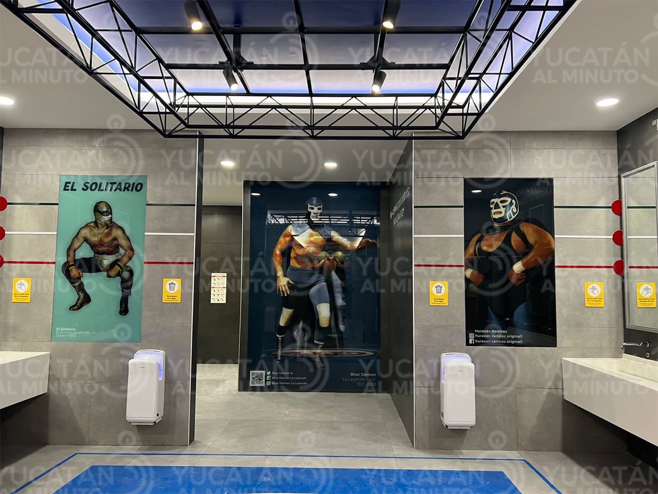 El Aeropuerto Felipe Ángeles cuenta con cinco baños temáticos, uno de ellos es el dedicado a la lucha libre, en el que puedes encontrar imágenes de recortes de viejas peleas, así como fotografías gigantes de luchadores emblemáticos, como el Santo, Rayo de Jalisco, Blue Demon, Huracán Ramírez, el Fantasma, Tinieblas, Fishman y el Solitario, entre otros.