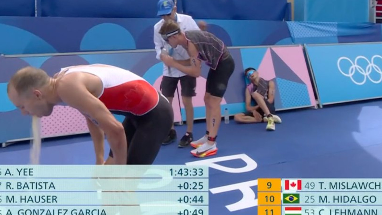 Tyler Mislawchuk, triatleta canadiense, fue captado vomitando al llegar a la linea de Meta en la competencia varonil de Triatlón en los Juegos Olímpicos de París 2024.