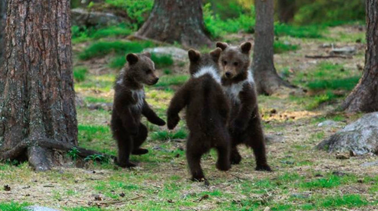 Un aficionado a la fotografía en Finlandia tuvo una extraordinaria oportunidad al fotografiar a 50 metros, desde un refugio, a tres pequeños osos jugando y bailando en círculo en el bosque.