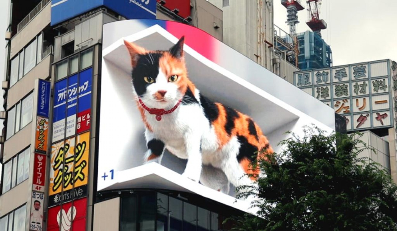 Una valla publicitaria en un edificio en Shinjuku, Tokio, Japón, que proyecta una imagen 3D de un gato causa sensación en las redes por lo real que parece.
