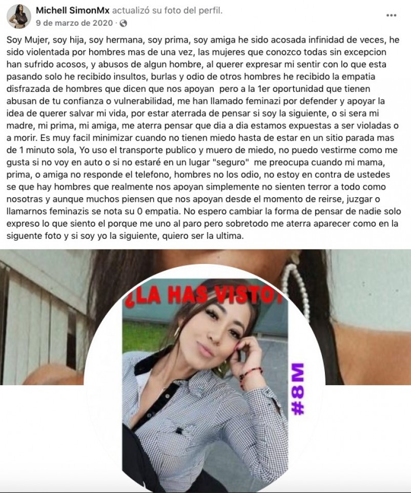 “Las mujeres que conozco todas sin excepción han sufrido acosos, y abusos de algún hombre... Me aterra pensar que día a día estamos expuestas a ser violadas o a morir (SIC)”.
