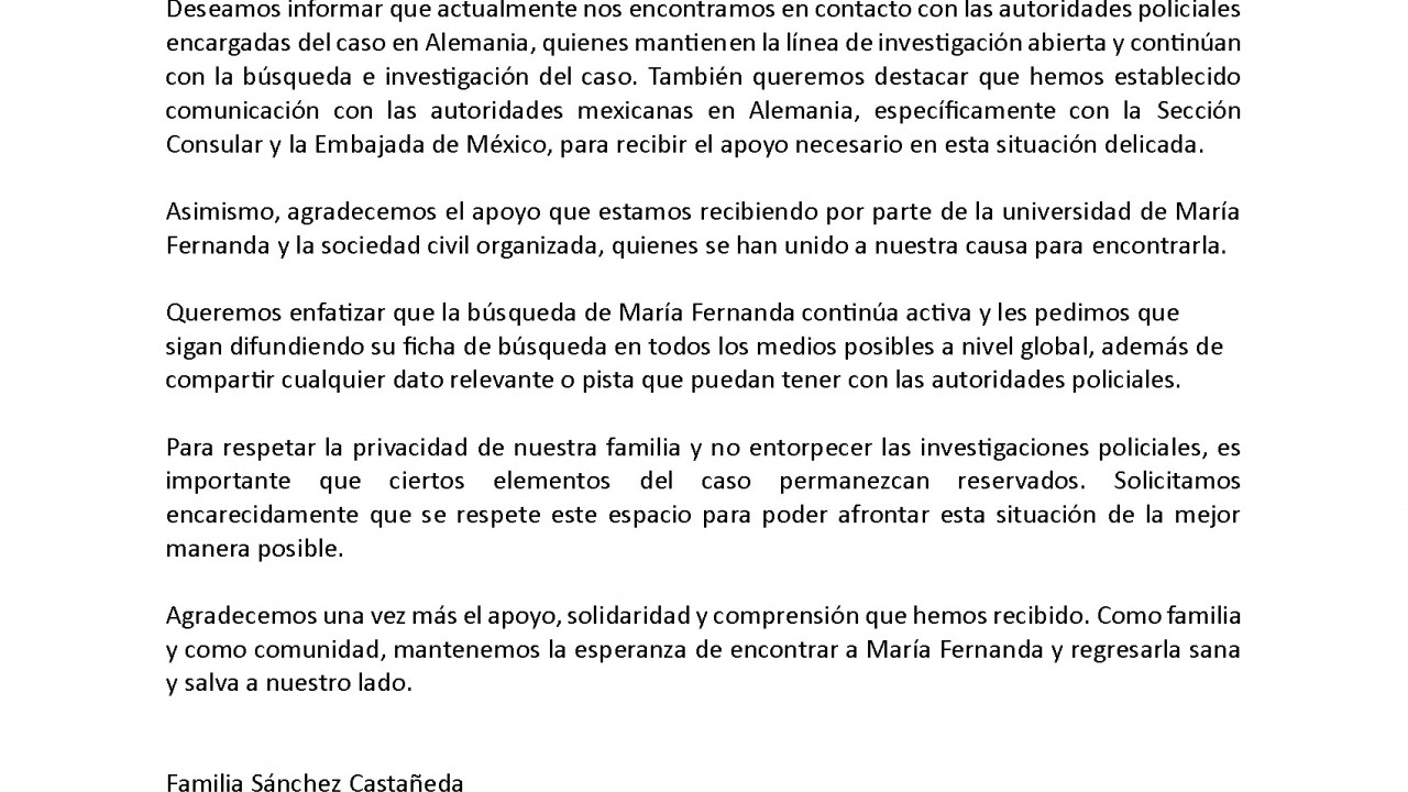 "Queremos enfatizar que la búsqueda de María Fernanda continúa activa y les pedimos que sigan difundiendo su ficha de búsqueda en todos los medios posibles a nivel global, además de compartir cualquier dato relevante o pista que puedan tener con las autoridades policiales”, manifestó.