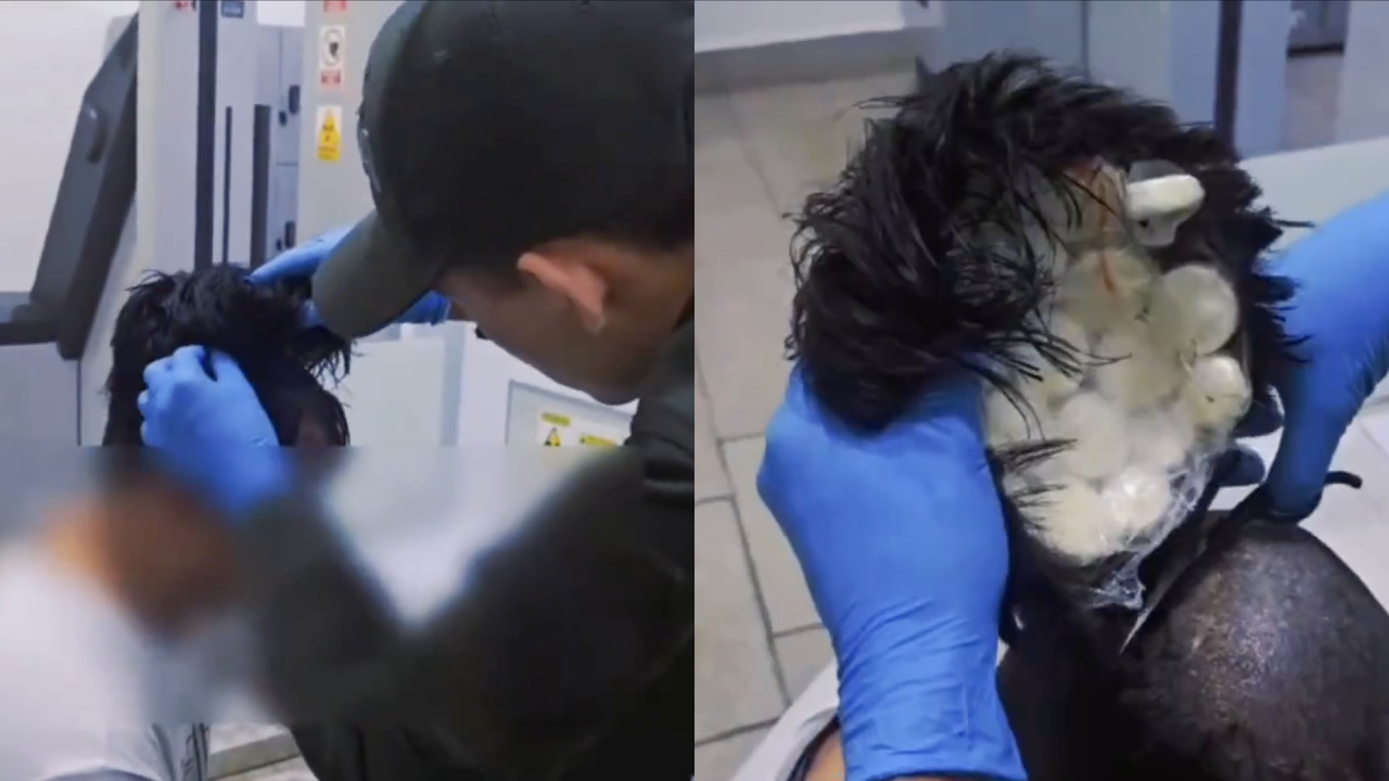 Luego de cortarle el cabello falso, encontraron al menos 400 dosis de cocaína distribuídas en 19 cápsulas, por lo que fue llevado ante las autoridades correspondientes.