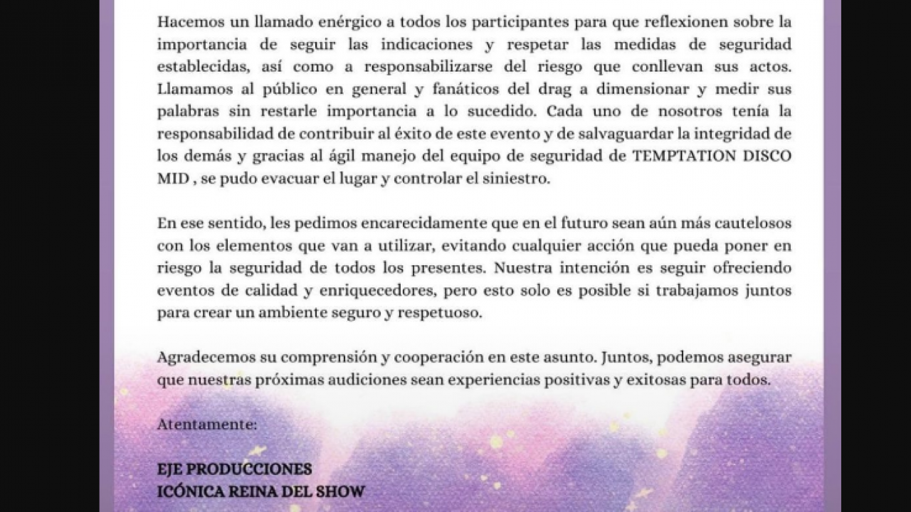 La producción emitió un comunicado en el que aseguró que pese a que estaba prohibido el uso de artefactos, la participante no siguió las reglas, poniendo en riesgo “el desarrollo del evento, la seguridad del lugar, el público presente y los jueces”, quienes estaban en primera fila.