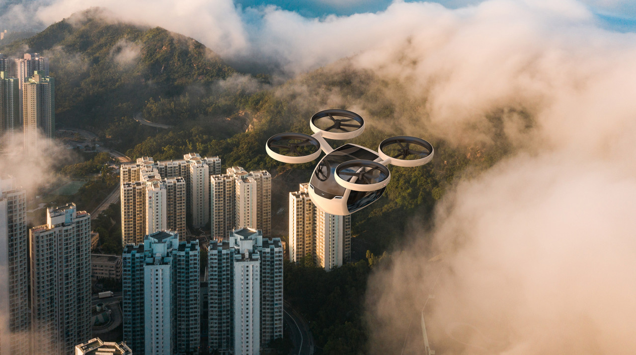 El diseñador italiano Andrea Ponti presentó un proyecto de un dron de pasajeros, para conectar la Hong Kong, Macao y nueve ciudades de la era de Cantón, en la “era post Covid”.