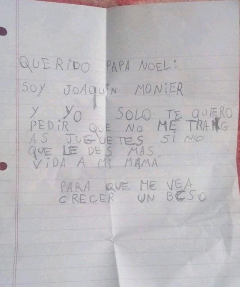Joaquín Monier, un niño de 11 años de Río Gallegos, en Argentina, envió por segundo año consecutivo una carta a Santa Claus, no pidiéndole juguetes, si no que le dé más vida a su mamá, quien lleva dos años en una dura batalla contra el cáncer.