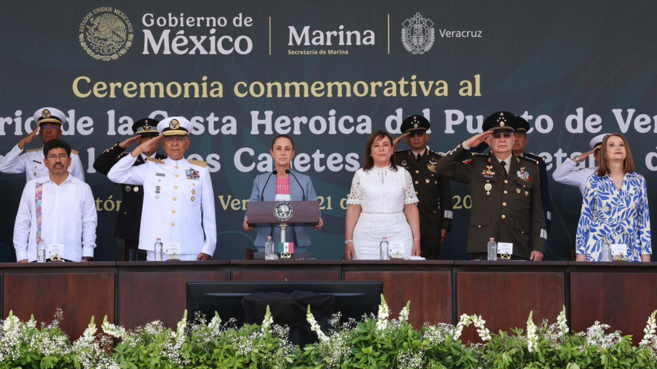 La presidenta de México, Claudia Sheinbaum Pardo, encabezó la ceremonia de Jura de Bandera de 419 cadetes de primer año de la Heroica Escuela Naval Militar y del Centro de Estudios Navales en Ciencias de la Salud, en el marco del 112 Aniversario de la Defensa del Puerto de Veracruz.