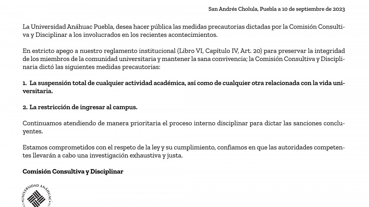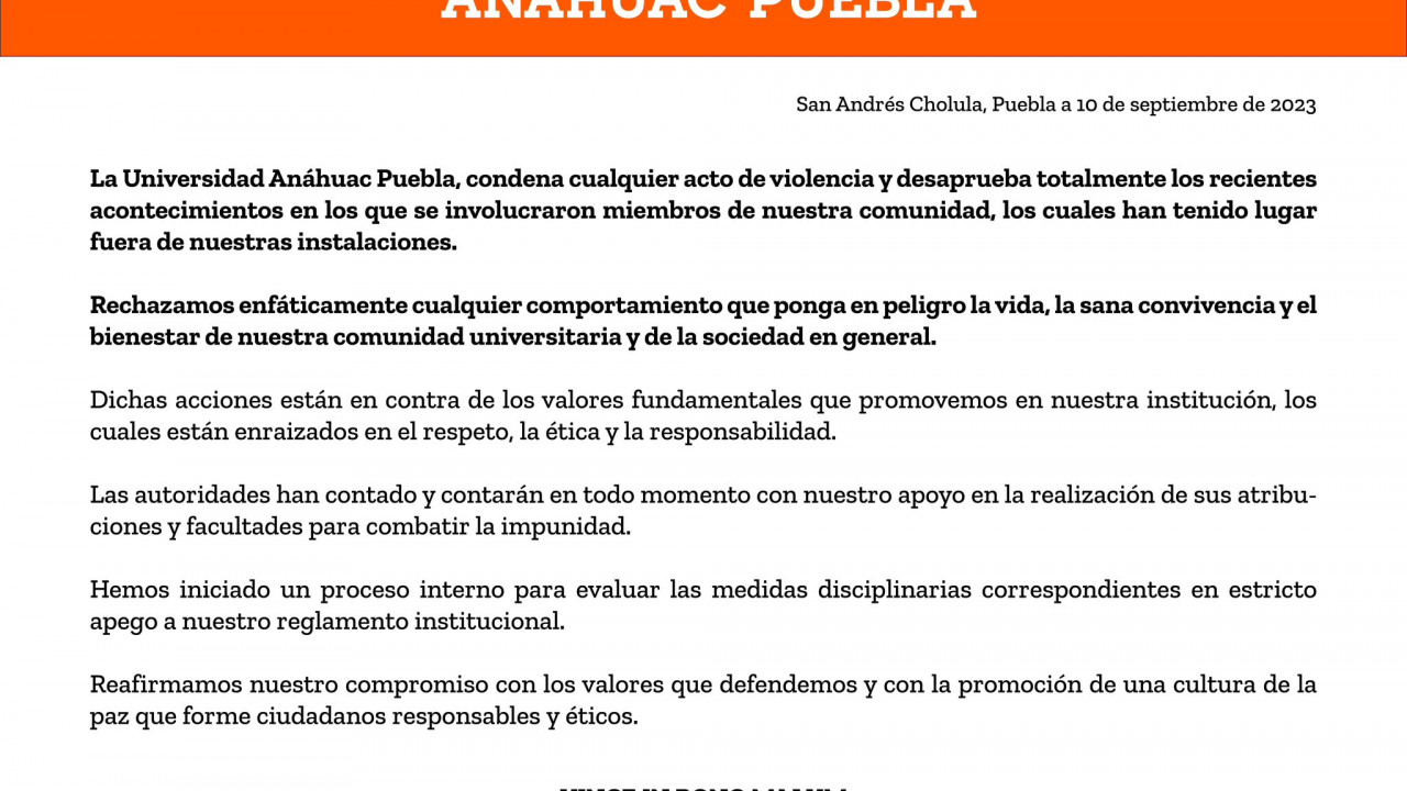 La Universidad emitió un comunicado en el que condenó la violencia la violencia de los hechos y anunció la suspensión de los alumnos involucrados y la prohibición de entrar al campus.