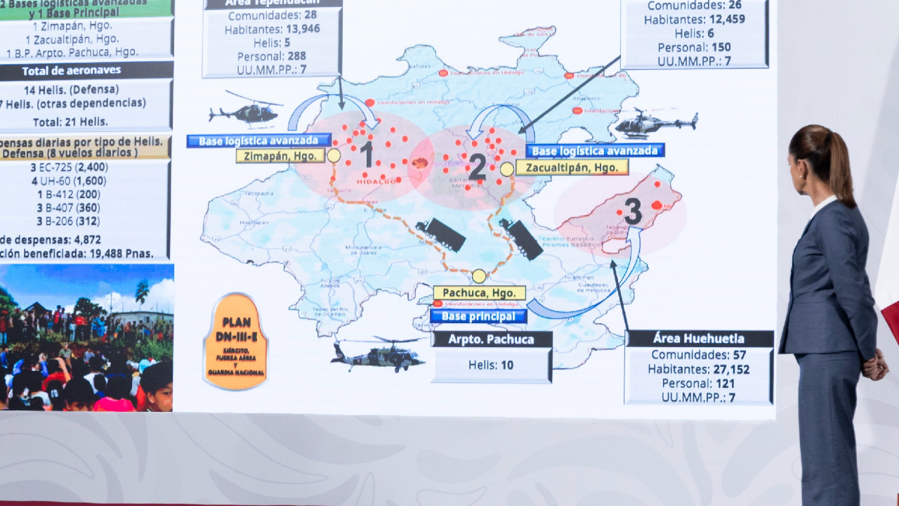 El Gobierno de México informa que, la Secretaría de la Defensa Nacional, activó en Hidalgo tres Centros de Mando con 111 puentes aéreos con 21 helicópteros: 14 aeronaves de la Defensa y siete de otras dependencias, estableciendo una Base Principal en el aeropuerto de Pachuca y dos Bases Logísticas Avanzadas en Zimapán y Zacualtipán, las cuales tienen la capacidad de trasladar al día 4 mil 872 despensas en beneficio de 19 mil 488 personas afectadas por las lluvias.