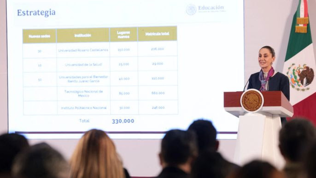 “Son 330 mil lugares nuevos para universitarios en todo el país, y se van a distribuir de esta manera: en la Universidad Nacional ‘Rosario Castellanos’ —así le vamos a nombrar—, son 150 mil espacios nuevos a lo largo del sexenio; en la Universidad de la Salud, 25 mil lugares nuevos; en las Universidades para el Bienestar ´Benito Juárez´, al menos 40 mil, aunque tiene posibilidad de más; el Tecnológico Nacional de México, 85 mil y en el Politécnico Nacional, 30 mil”. “Nos estamos comprometiendo a que, en el siguiente ciclo escolar, el del 25-26, avancemos en la gratuidad también del Tecnológico Nacional de México y del Instituto Politécnico Nacional”, puntualizó en la conferencia matutina, las “Mañaneras del pueblo”.