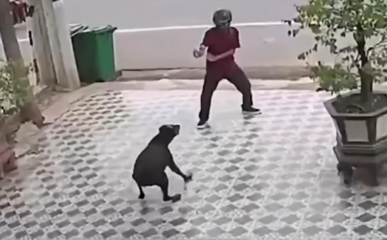 Un video captado por las cámaras de seguridad en algún país de Asia se volvió viral ya que muestra a un hombre caminando tranquilamente por una terraza, cuando un par de perros corre hacia él con la intención de atacarlo.
