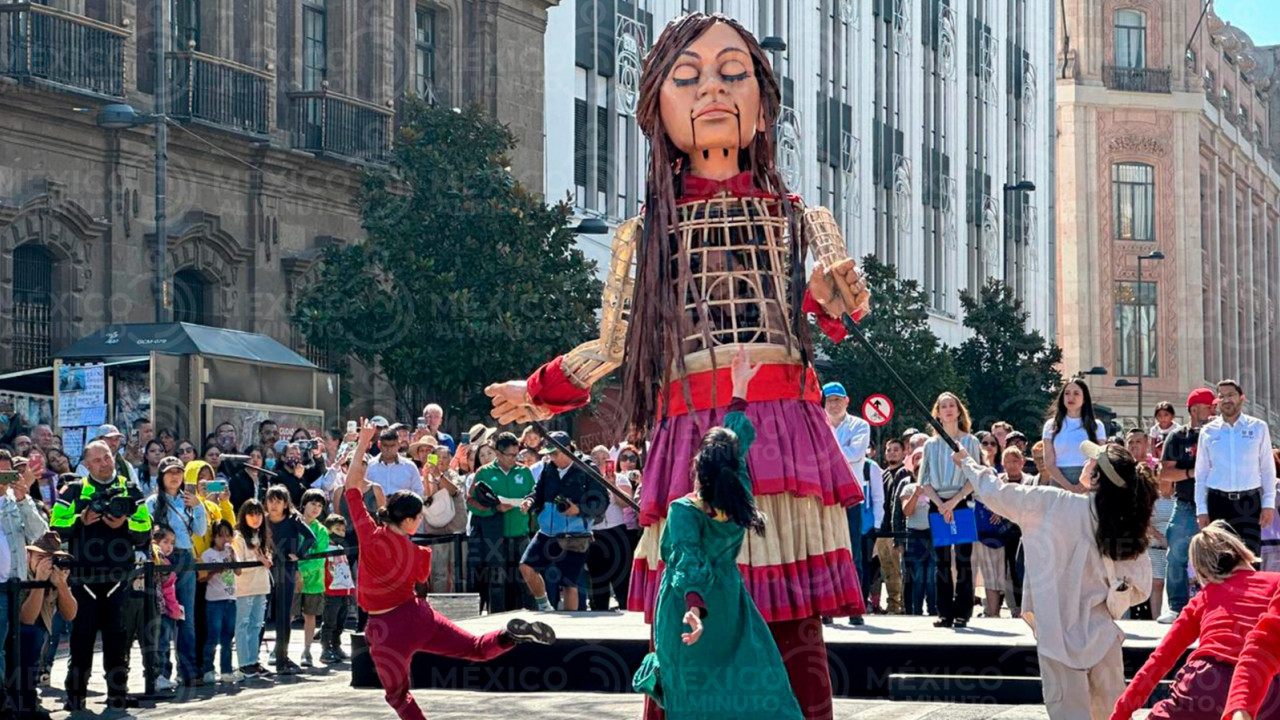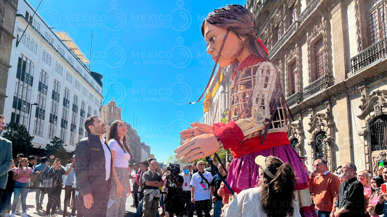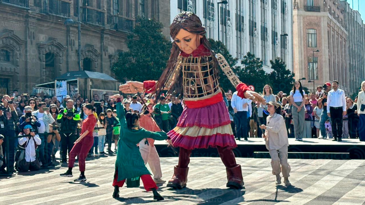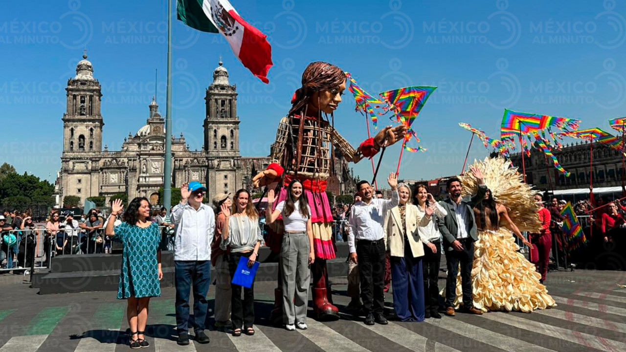 Con un mensaje de esperanza y solidaridad, la muñeca Amal llegó al Zócalo de la Ciudad de México, donde fue recibida por autoridades estatales y espectadores tal como el Jefe de Gobierno Martí Batres.