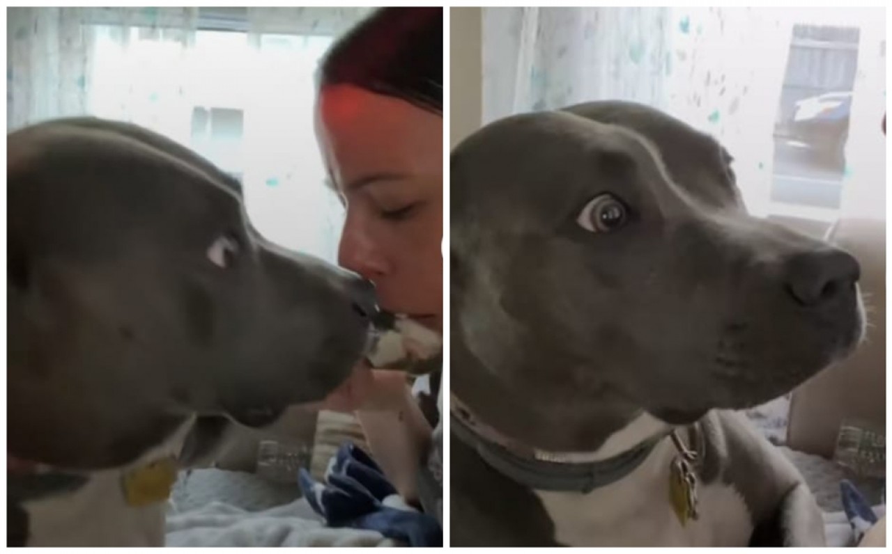 En el video, compartido en TikTok por el usuario @jcard.11 se ve cómo una mujer le “da una mordida” a un pitbull gris y luego finge que mastica”, lo que el perrito ve con ojos desorbitados.
