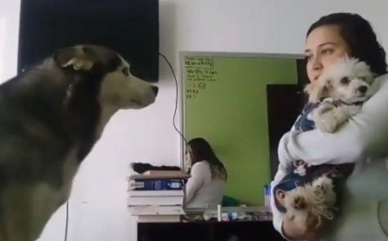 "No debes andar pegándole a Tomás. Él es chiquito y tu estás grandote. Malcriado. Yo ya no te voy a querer. ¿A ver quién te va a dar de comer ahora?”, le dice la mujer, pero de inmediato cede ante el Husky, que se acerca a lamer a ambos como disculpa.