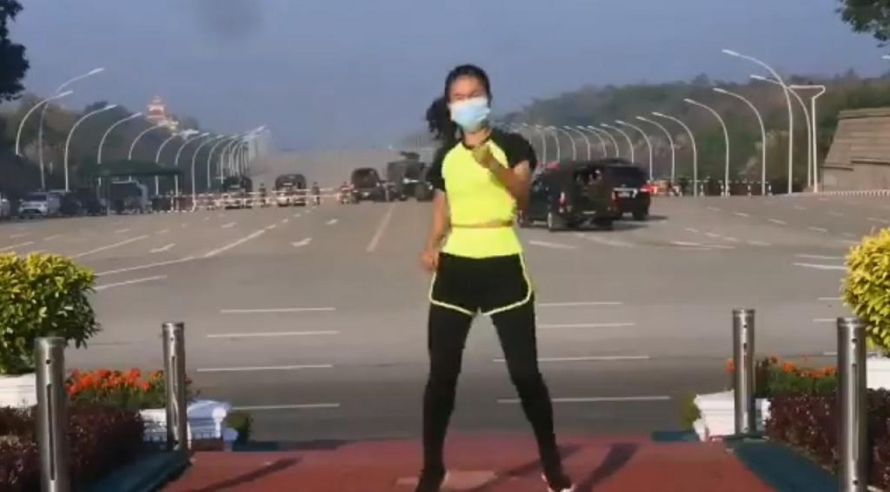 Khing Hnin Wai, una instructora de aerobics en Birmania, grababa una rutina al frente del Parlamento nacional, sin percatarse que detrás de ella una caravana de de camionetas negras se dirigìa a la Asamblea de la Unión.