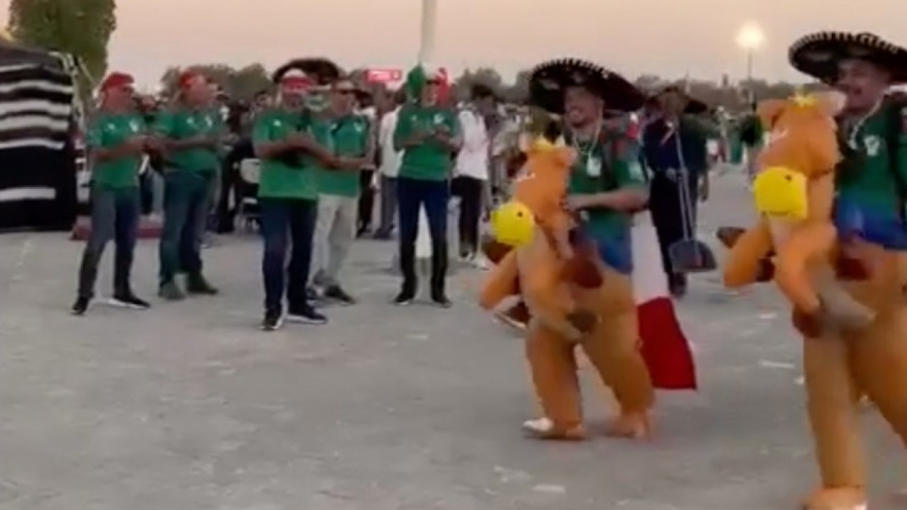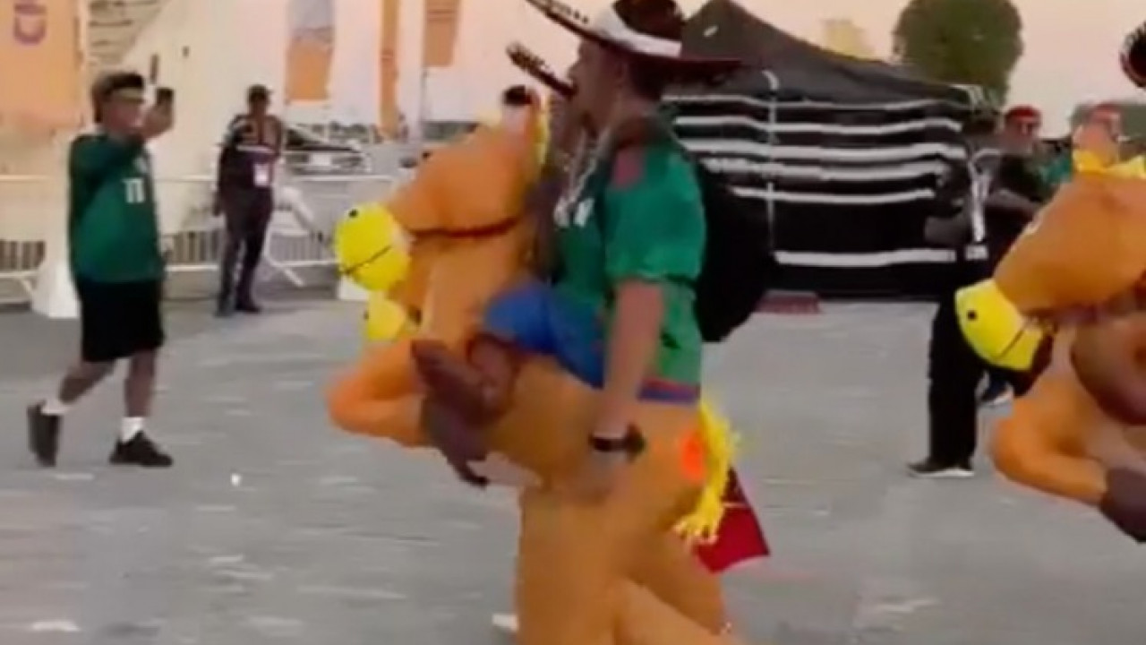 Los mexicanos continúan causando revuelo en tierras mundialistas, ahora un grupo de aficionados se hicieron virales al desfilar con botargas inflables de caballos durante una cabalgata de autoridades.