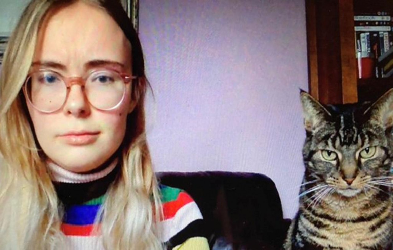 Abby Tomlinson, una bloguera británica, compartió una imagen de ella y su gato, de mirada muy intimidante, mirando directo a la cámara, en la que dice que el felino “se ha obsesionado con sentarse junto a mí durante mis llamadas de Zoom”.
