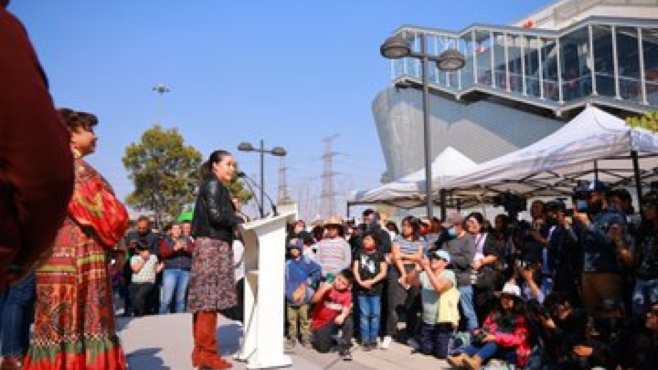 Clara Brugada, alcaldesa de Iztapalapa, la acompañó a la develación de la obra artística este lunes, en la que se plasmó la imagen de la joven y la frase “Sueña en grande”.