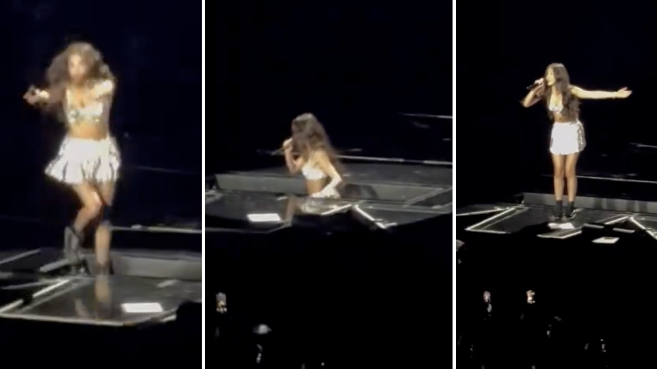 Mientras bailaba y corría por el escenario, la cantante terminó fuera de la escena, pero se levantó rápidamente, como si nada hubiera pasado.