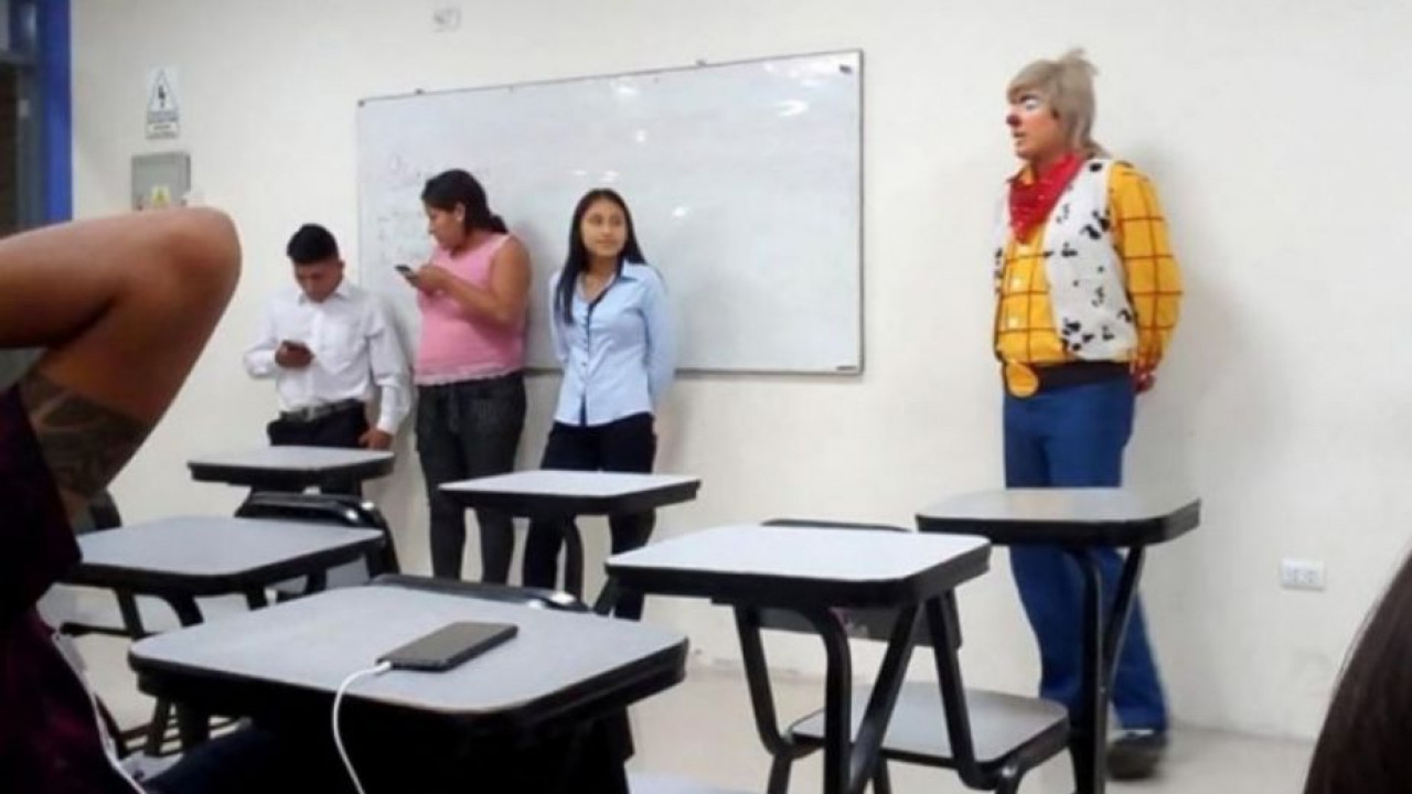 Raúl Rivera, estudiante de Derecho también trabaja de payasito, pero en esta ocasión no le dio tiempo de cambiarse y tuvo que exponer en clase, momento que cautivó a las redes, que lo aplaudieron porque no tiene miedo al que dirán.