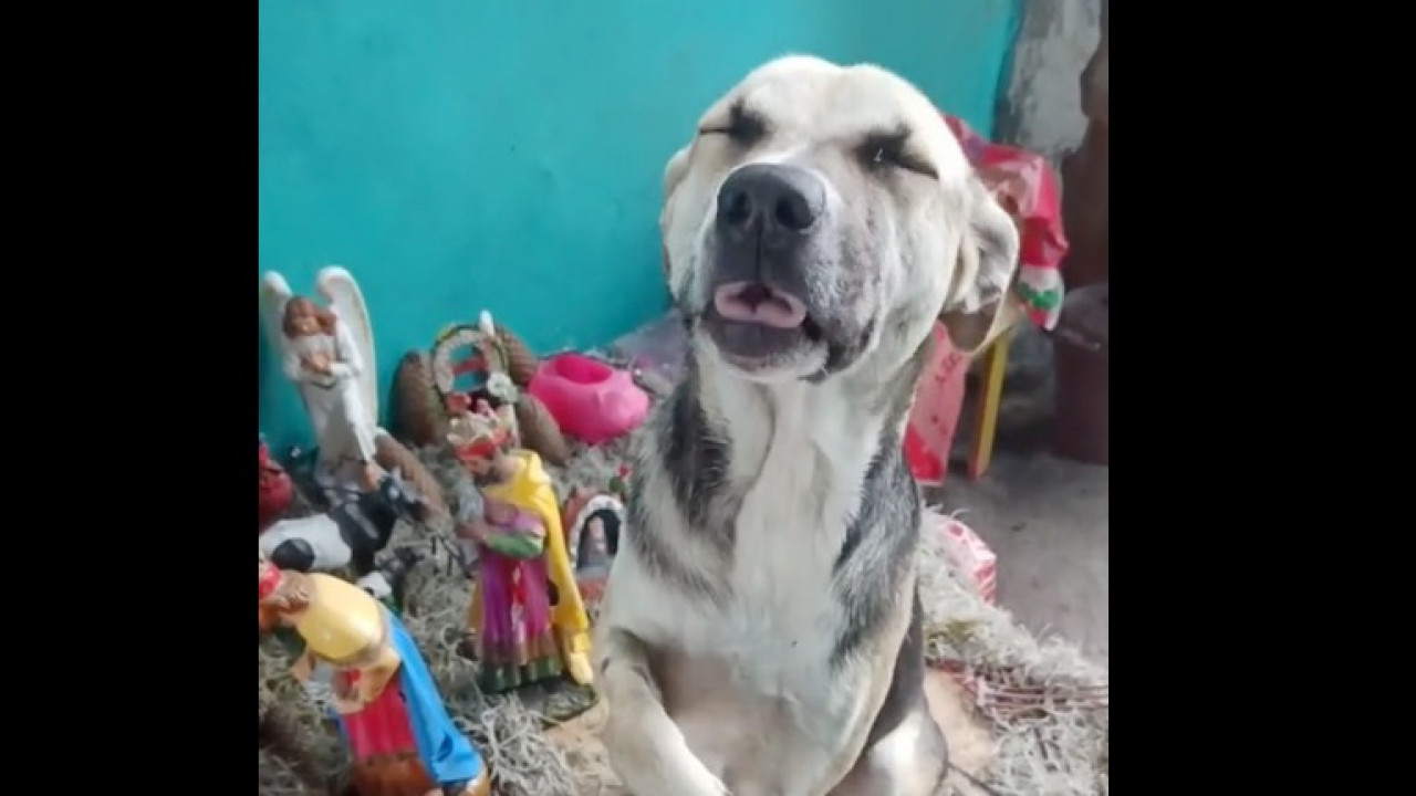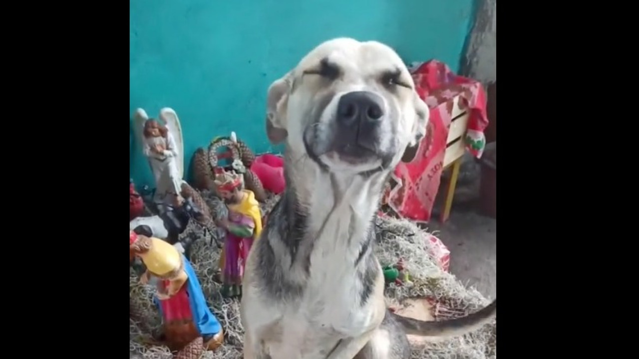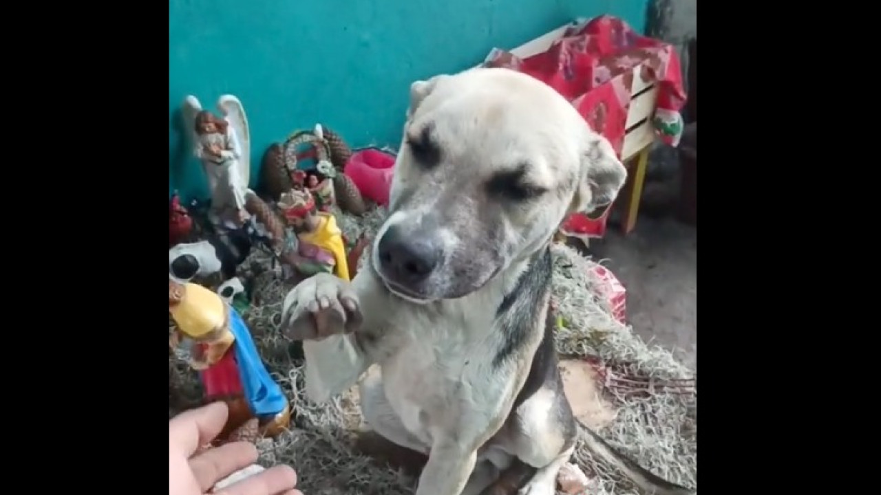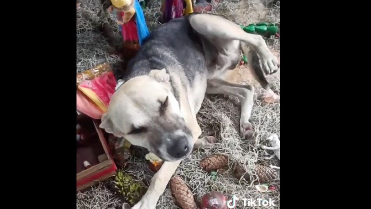 El perrito “Dorito” se quedó dormido en el heno del nacimiento que puso su familia, porque estaba cómodo y caliento, pero César, uno de sus dueños, lo sorprendió.