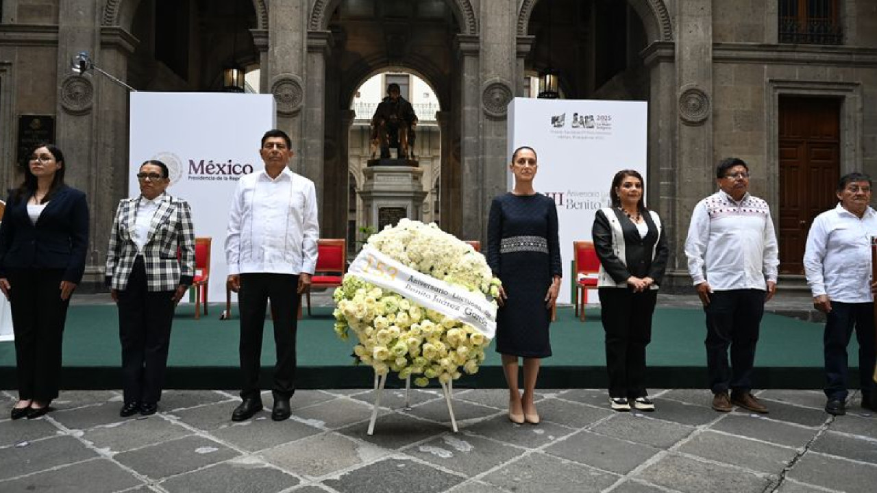 En el Recinto de Homenaje a Don Benito Juárez, la Jefa del Ejecutivo Federal, montó una guardia de honor y guardó un minuto de silencio en memoria Benemérito de las Américas, en compañía de la secretaria de Gobernación, Rosa Icela Rodríguez Velázquez: la Jefa de Gobierno, Clara Brugada Molina; el gobernador de Oaxaca, Salomón Jara Cruz; el director general del Instituto Nacional de los Pueblos Indígenas (INPI), Adelfo Regino Montes; el presidente municipal de Guelatao de Juárez, Oaxaca, Isaías García Soto; y la historiadora del Instituto Nacional de Estudios Históricos de las Revoluciones de México (INEHRM), Tamara Aranda Ramos.