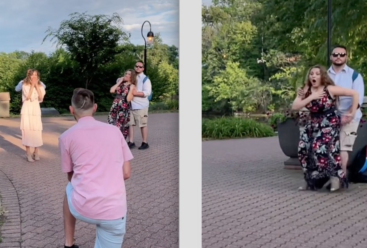 En el clip de TikTok de la usuaria Aleena Marnee se observa a un grupo de mujeres rodeando a una tercera, mientras el novio espera arrodillado, tras lo cual se separan y el esposo de una de ellas retira estratégicamente a una de la pedida de mano, ya que sabían que tendría una reacción exagerada.