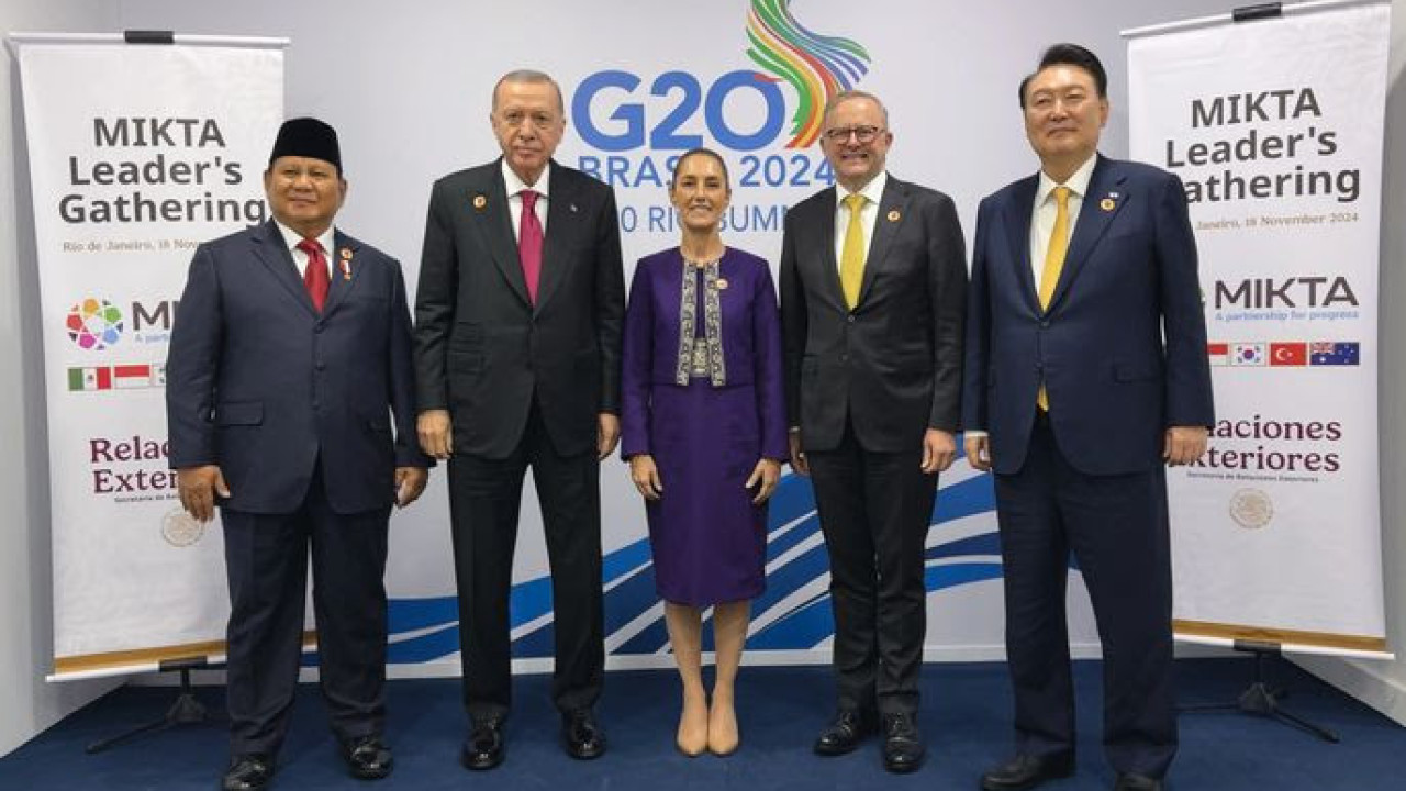 Los líderes de México, Claudia Sheinbaum, Indonesia, Prabowo Subianto, la República de Corea, Yoon Suk Yeol, Türkiye, Recep Tayyip Erdoğan, y Australia, Anthony Albanese, miembros de MIKTA, se reunieron en los márgenes de la Cumbre de Líderes del G20, en Río de Janeiro.