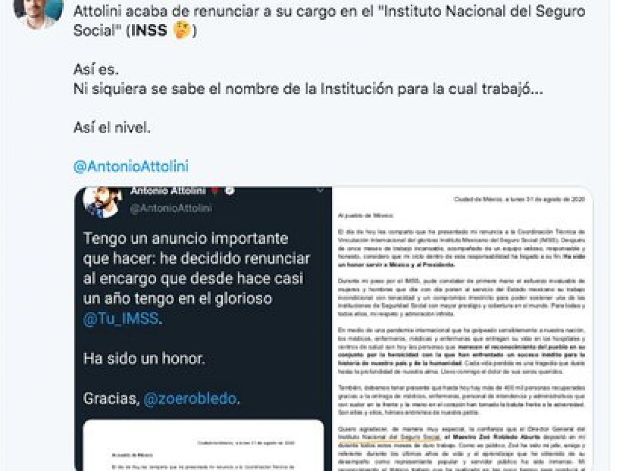 Lo que generó más ruido fue que en su carta de renuncia se refirió a Zoé Robledo como director del Instituto Nacional del Seguro Social, lo que de inmediato desató tales burlas que con razón no había hecho nada, si ni siquiera había podido aprenderse el nombre de la institución.