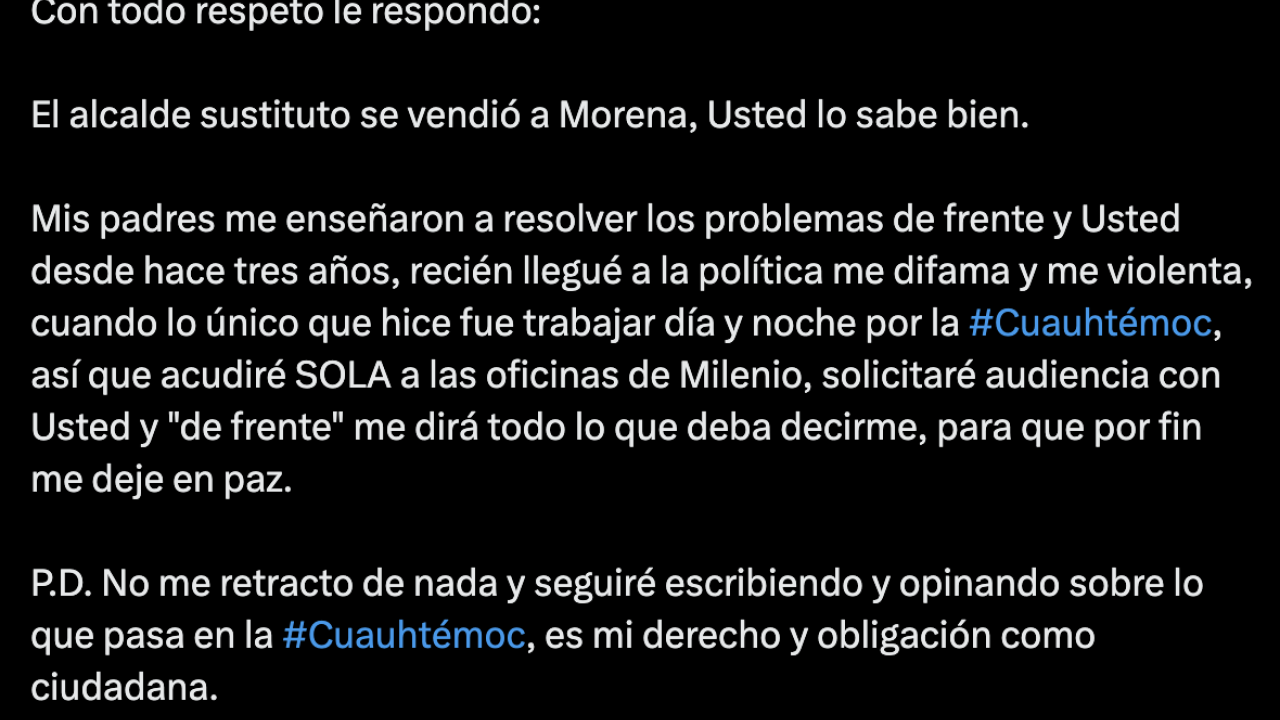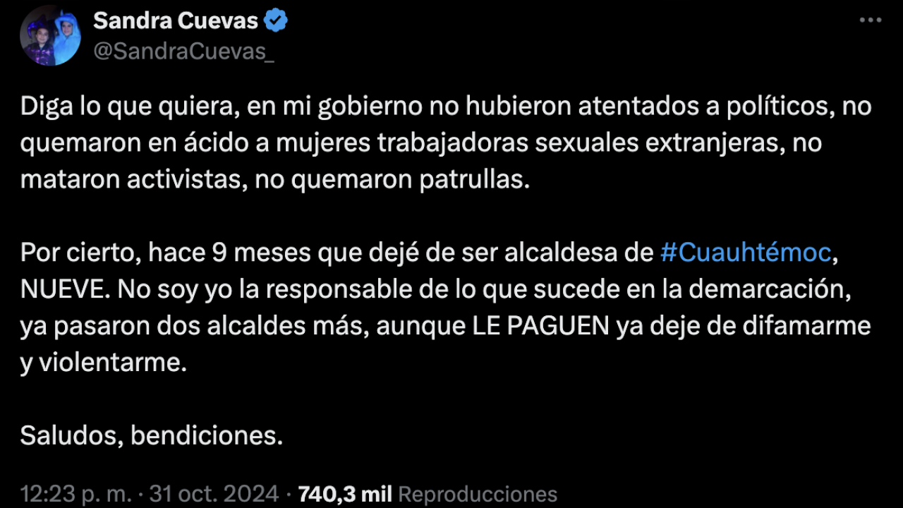 Cuevas defiende que durante su gestión “no hubieron atentados a políticos, no quemaron en ácido a mujeres trabajadoras sexuales extranjeras, no mataron activistas, no quemaron patrullas”, y pidió al comunicador que dejará de violentarla, además de inferir que le pagan por difamarla.