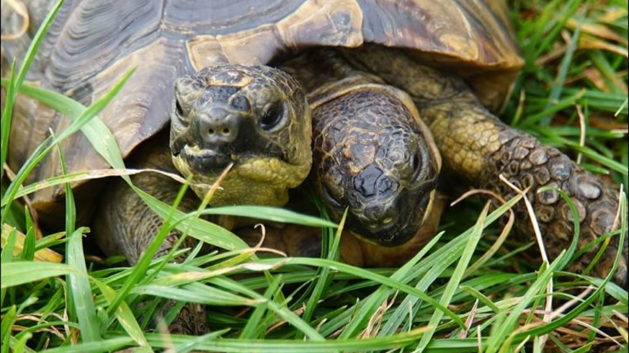 Janus es una tortuga de dos cabezas, huésped del Museo de Historia Natural de Ginebra, que celebró 25 años entre flores y frutas, un número inusual para un animal con esta condición.