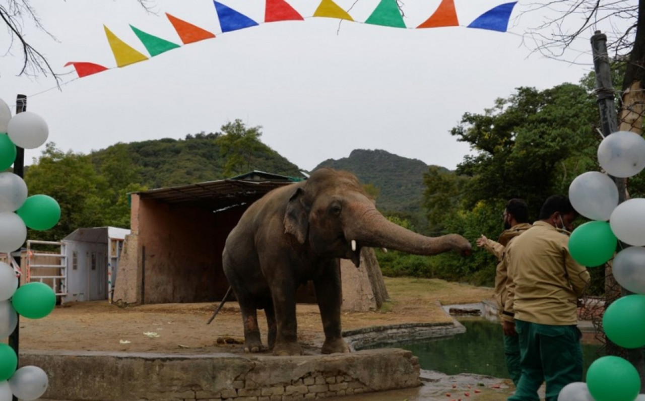 Four Paws International, que estuvo detrás de la campaña de ayuda al animal, así como otras organizaciones locales, le organizaron una fiesta de despedida con globos, guirnalda y hasta grupos de música en el zoológico de Islamabad.