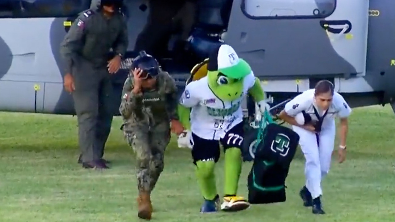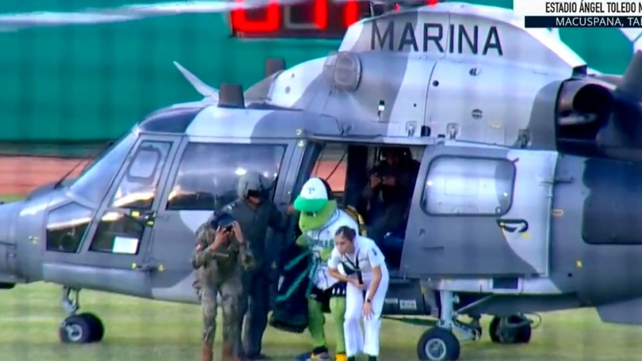La Secretaría de Marina prestó helicóptero para transportar a la mascota del equipo de los Olmecas de Tabasco, al inicio de los playoffs en la Liga Mexicana de Béisbol, en el estadio Ángel Cuco Toledo, en el Municipio de Macuspana, lo que sorprendió a aficionados, este miércoles.