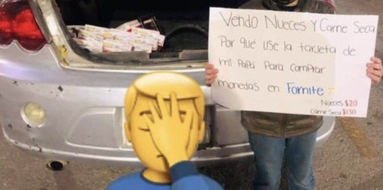 El usuario de Twitter @wereverwero fue quien compartió la imagen del niño frente a una cajuela con los productos y una cartulina en sus manos con la leyenda “Vendo Nueces Y Carne Seca por qué use la tarjeta de mi papá para comprar monedas en Fornite (SIC)”.