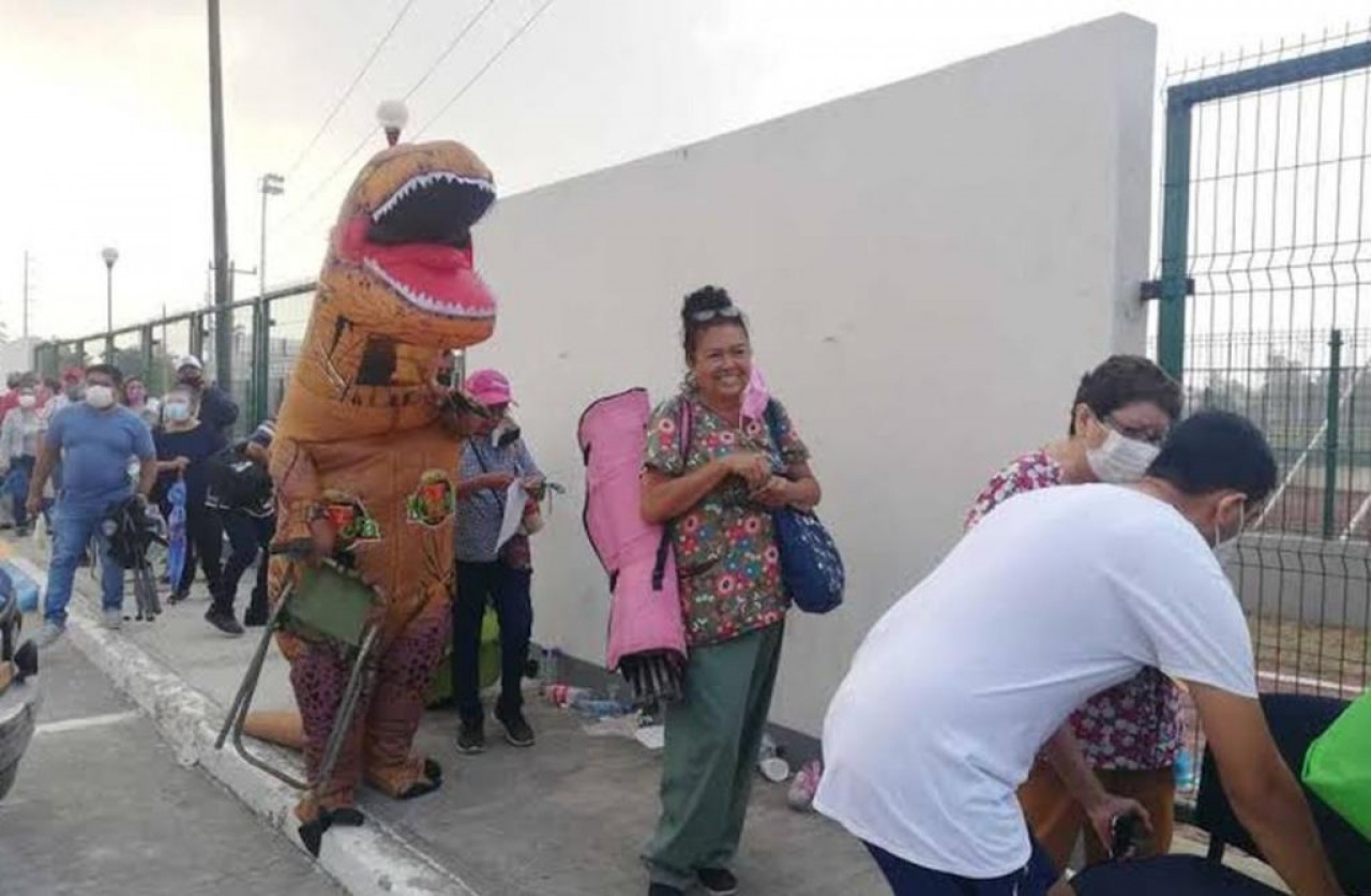 Mardonio Rivera quiso acompañar a su mamá a vacunarse, pero para que las horas pasaran más rápido para ella durante la espera, decidió vestirse de dinosaurio, lo que causó asombro y risa en la fila de personas que también esperaban por su dosis en un módulo de Ciudad Madero, Tamaulipas.