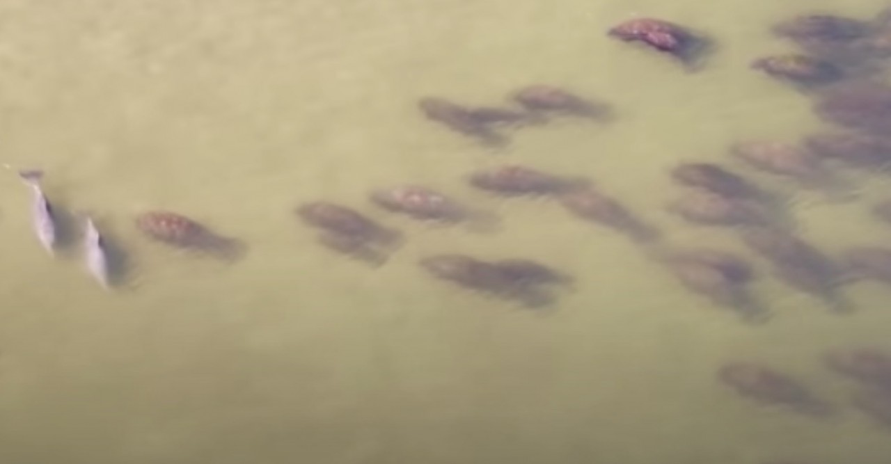 VIDEO: Delfines juegan entre enorme manada de manatíes