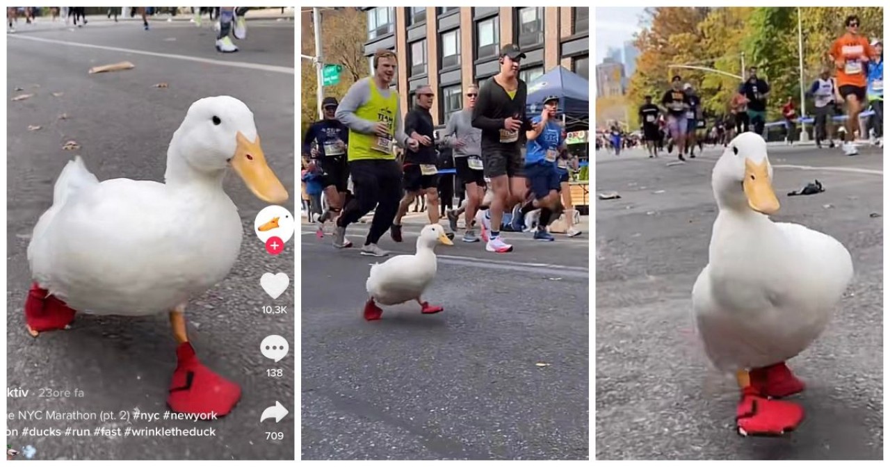 Un pato llamado Wrinkle se robó la atención en el maratón de Nueva York, al correr con zapatillas especiales junto con los atletas participantes.