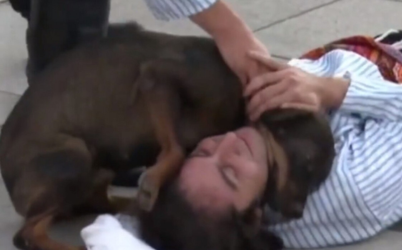 El perrito se acercó al hombre en la calle y se tendió sobre su cuello con la intención de brindarle consuelo, a lo que el actor, sus compañeros y los espectadores no pudieron más que enternecerse por la inocencia del can.