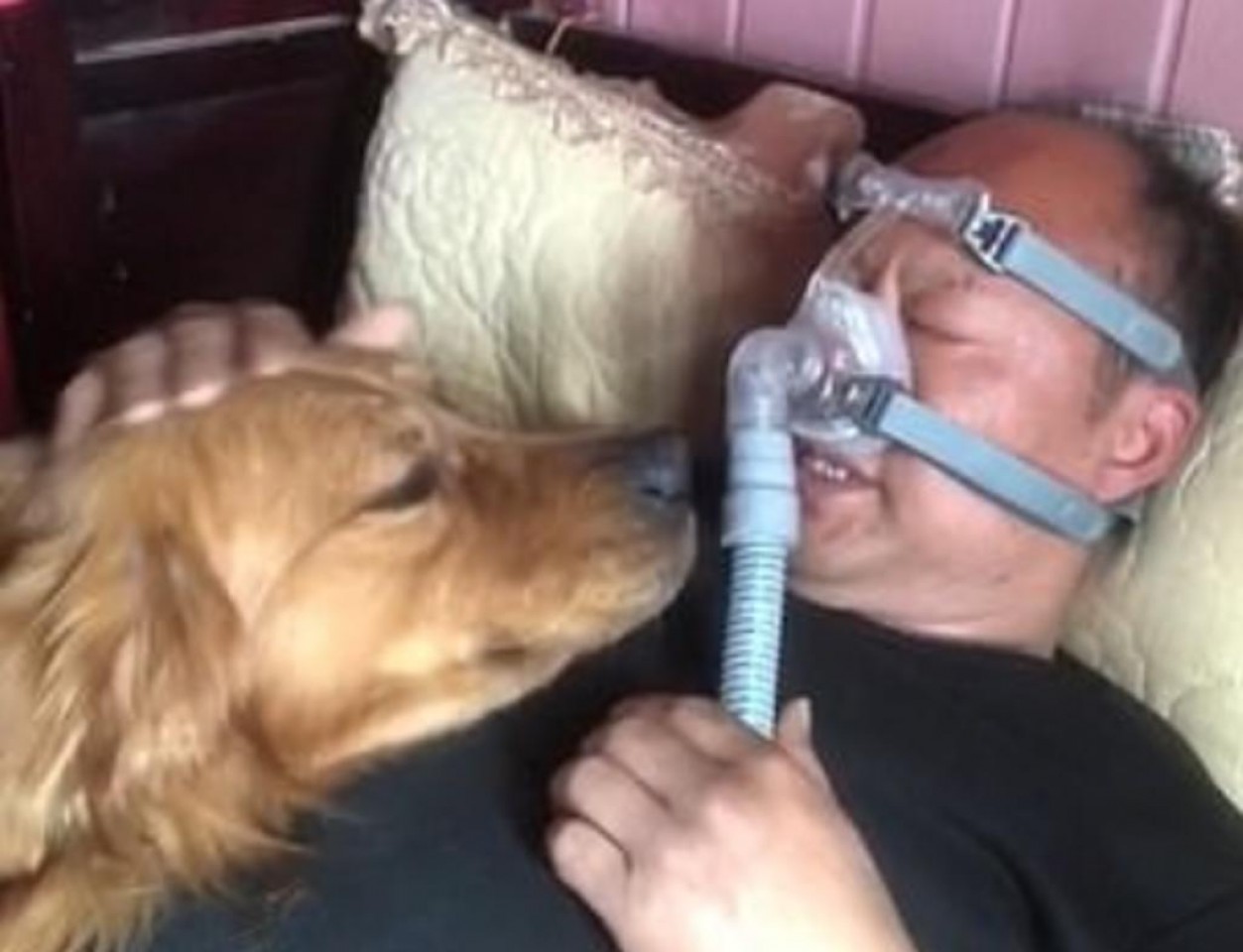 VIDEO. Lomito no se separa de dueño con aparato de respiración