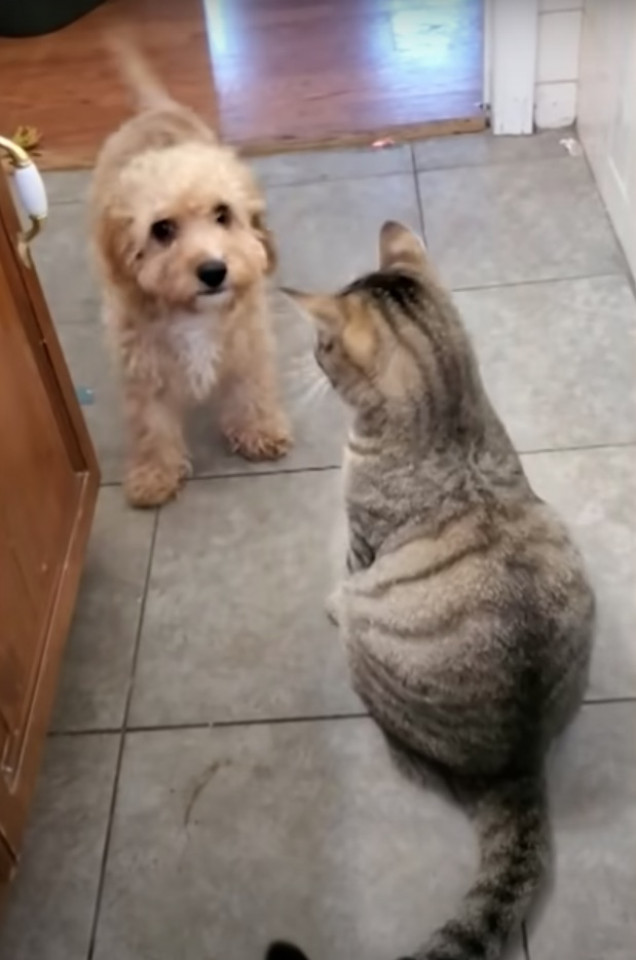 Louie, un cachorro de cuatro meses, trataba de entrar al baño de su casa, pero Marvin, el gato de siete años, parecía no estar de humor y se lo impidió dándole un arañazo, a lo que el lomito no tuvo más remedio que ir por refuerzos