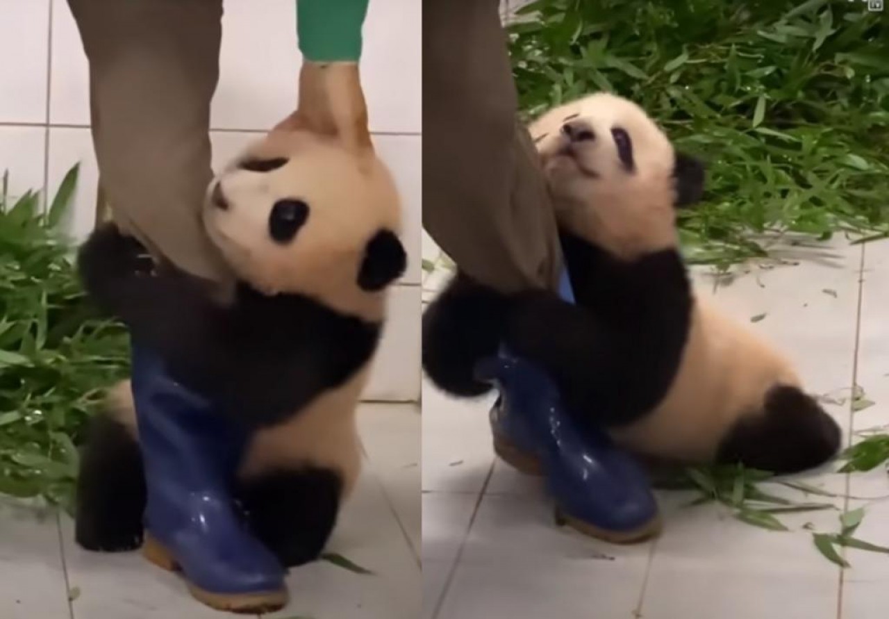 FuBao, una osita panda de seis meses, despertó la ternura de las redes al ser grabada en el momento en que se aferra a la pierna de uno de sus cuidadores.