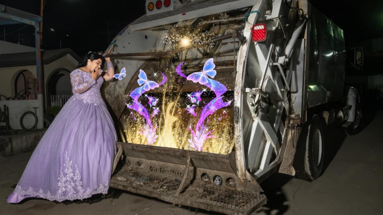 Quinceañera homenajea a su padre con fotos en su camión de basura