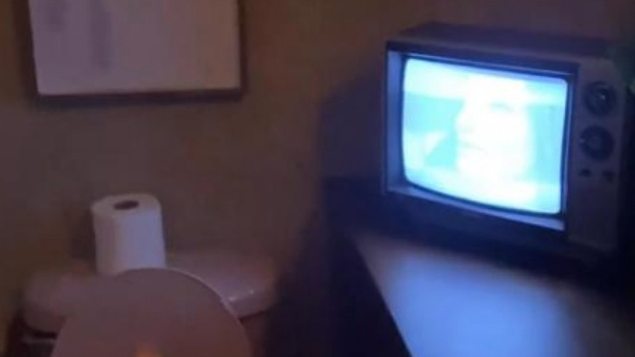 Baño con televisión antigua, en restaurante