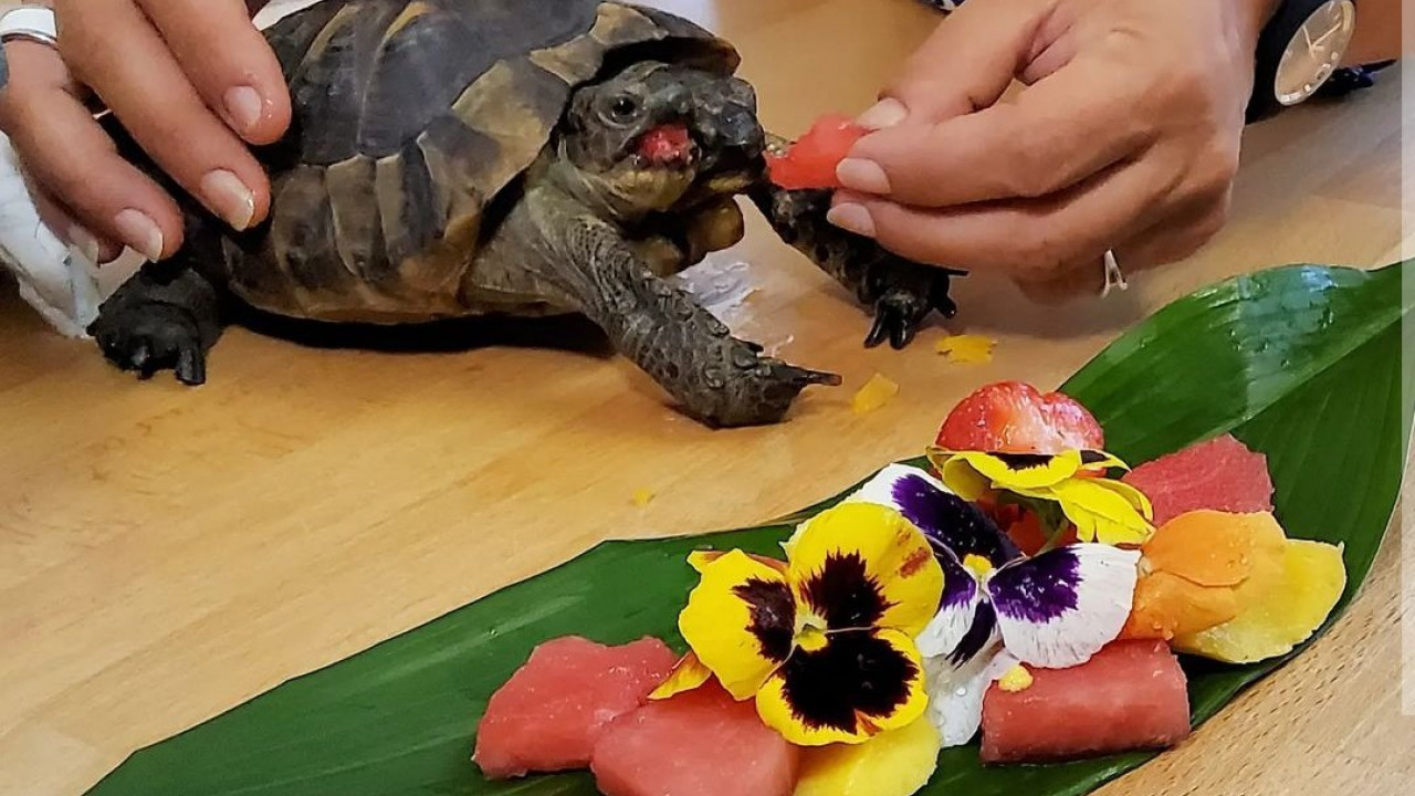 Tortuga bicéfala celebra 25 años con fruta y flores