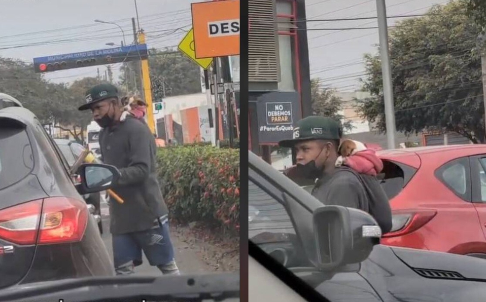 Como si fuera bebé, carga a perrito mientras trabaja